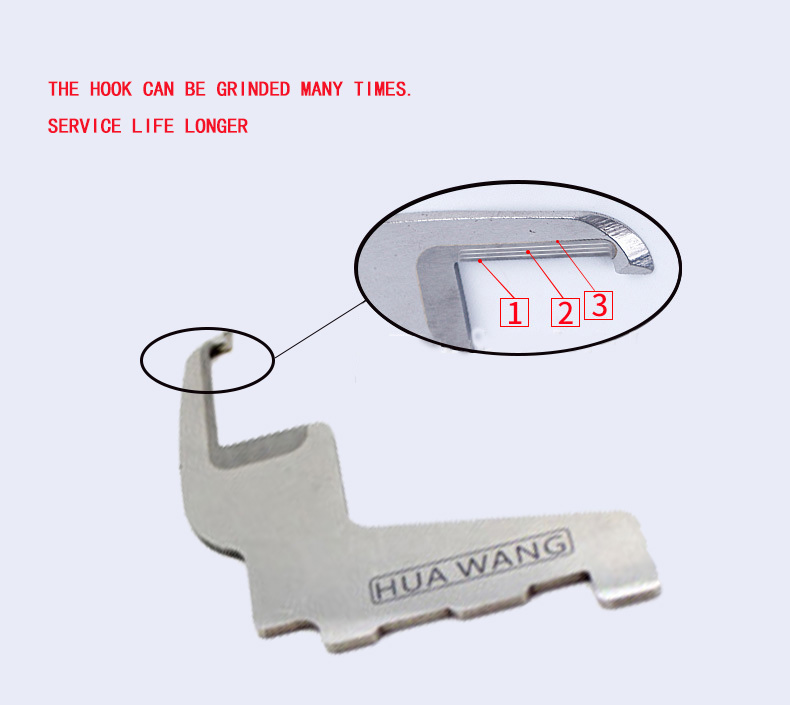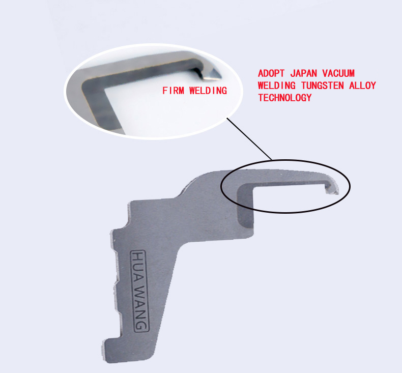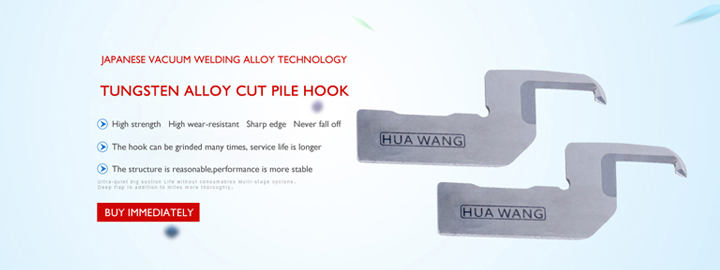 Huawang new develops Tungsten alloy tufted hook for carpet and artificial machine. Hooks are adopting imported special steel, and the edge adopts tungsten steel(Hardness of HRA95-98), welding by the technology of vacuum welding tungsten alloy of Japan, welding high strength, firm, never shedding. Tungsten alloy steel does not break apart and the substrate (hook handle) of the hook can not be annealed, and the hardness can reach hrc61-63. Meanwhile ensures the wear of the hook sharp and the needle, which can realize stability without knocking over and dropping yarn when high-speed cutting.
